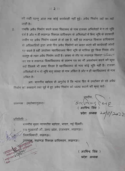 शिव राम निषाद ने एक शिकायती पत्र माननीय उच्च न्यायालय को लिखा था,जो की अनिल यादव और बी0एस0एन0बी0 कॉलेज के संबंध में अवैध निर्माण पर था। लेकिन एलडीए द्वारा कार्रवाई का विवरण किसी और अन्य व्यक्ति का दिया जा रहा है। मुख्यमंत्री योगी आदित्यनाथ की सरकार एवं अफसर ने अपने अपने चहेतों को बचाने को पूरा खेल खेला जा रहा है और अभी तक निर्माण कार्य शुरू है वही गरीब असहाय लोगों पर बुलडोजर चलाया जा रहा है।