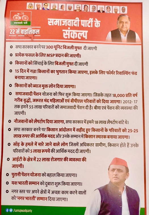 अखिलेश यादव ने कहा कि पहले की तरह समाजवादी सरकार बनने पर फिर से लैपटॉप बांटेंगे। भाजपा अपने संकल्प पत्र को चुनावी जुमला बनाकर झूठे विज्ञापन छपवा रही है। वह आंकड़ों से खिलवाड़ करती है। जब भाजपा घिर जाती है तो बुनियादी मुद्दों से हट कर काम करती है। भाजपा सरकार ने बिजली कारखाने का काम रोक दिया। लोगों को महंगी बिजली दी। जब समाजवादी पार्टी ने 300 यूनिट बिजली मुफ्त देने की बात की तो भाजपा सरकार ने बिजली का बिल आधा कर दिया। सरकार बताए साढ़े चार साल तक जनता को महंगी बिजली देकर उनकी जेब क्यों काटी?राज्यकर्मियों एवं शिक्षकों के लिए पुरानी पेंशन की बहाली होगी। उसके लिए हमने पूरी तैयारी की है, वित्त विशेषज्ञों से परामर्श किया है। उन्होंने कानून व्यवस्था के प्रश्न पर कहा कि इसकेे बेहतर इंतजाम होंगे। महिलाओं की सुरक्षा के विशेष प्रबन्ध होंगे। 1090 वूमेन पावर लाइन में सुधार लाएंगे। यूपी डायल 100 में और गाड़िया दी जाएगी तथा 108 नम्बर एम्बूलेंस सेवा का और विस्तार होगा।