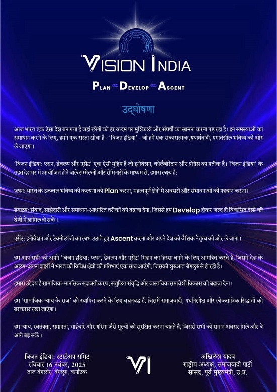 आज ‘विजन इंडिया‘ का प्रारूप रखते हुए अखिलेश यादव ने कहा कि देश में विभाजनकारी और पुरातनपंथी ताकतों से निबटने के लिए नई सोच और प्रगतिशील इरादों के साथ युवा भारत को आगे लाना है। उन्हांने कहा कि नई पीढ़ी के सोच में सहिष्णुता प्रेम और सम्मान है। वह दयाुल और प्रगतिपंथी है। विजन इंडिया, स्टार्टअप समिट की पहली बैठक 16 नवम्बर 2025 को ताज बंगलोर, बेगलुरू, कर्नाटक में होगी। इसके मुख्य समन्वयक राजीव राय सांसद होंगे और मुख्य संयोजक पूर्व मंत्री अभिषेक मिश्र होंगे।