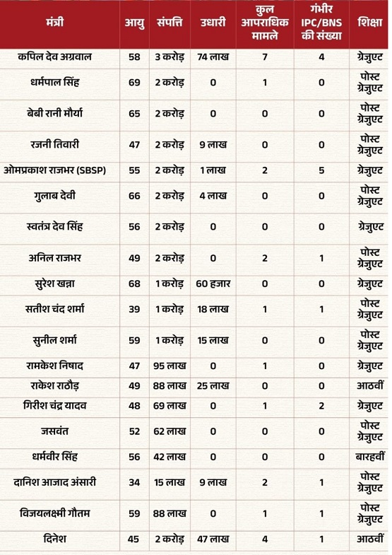 एडीआर की रिपोर्ट में योगी कैबिनेट के 45 मंत्रियों का विश्लेषण किया गया। इनमें से 39 मंत्री करोड़पति हैं। मंत्रियों की औसत संपत्ति करीब 9 करोड़ रुपये है। मयंकेश्वर शरण सिंह सबसे ऊपर हैं। उनकी संपत्ति में चल और अचल दोनों तरह की संपत्ति शामिल है। दूसरे नंबर पर राकेश सचान (करीब 37 करोड़) और तीसरे पर नंद गोपाल गुप्ता नंदी (करीब 37 करोड़) हैं। अन्य मंत्री जैसे नितिन अग्रवाल (31 करोड़) और रविंद्र जायसवाल (27 करोड़) भी अमीरों की सूची में हैं। संपत्ति से 14 फॉर्च्यूनर खरीद सकते हैं। 58 करोड़ रुपये की यह राशि बहुत बड़ी है। अगर हम महिंद्रा फॉर्च्यूनर कार की कीमत देखें, जो लगभग 50 से 60 लाख रुपये से शुरू होती है, तो इस रकम से आसानी से 14 फॉर्च्यूनर गाड़ियां खरीदी जा सकती हैं। यह आंकड़ा दिखाता है कि मंत्री की संपत्ति आम आदमी की समझ से काफी ऊपर है। यह संपत्ति ज्यादातर जमीन, मकान, निवेश और अन्य स्रोतों से आई है।