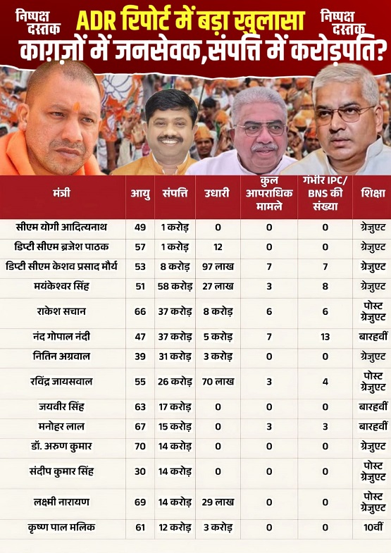 उत्तर प्रदेश सरकार के मंत्रियों की संपत्ति को लेकर एसोसिएशन फॉर डेमोक्रेटिक रिफॉर्म्स (ADR) की रिपोर्ट सामने आई है, जिसने सियासी हलकों में हलचल मचा दी है। रिपोर्ट के अनुसार योगी आदित्यनाथ की कैबिनेट के 45 मंत्रियों में से 39 मंत्री करोड़पति हैं। सबसे अमीर मंत्री अमेठी की तिलोई सीट से विधायक और राज्यमंत्री स्वतंत्र प्रभार मयंकेश्वर शरण सिंह हैं, जिन्होंने 58.07 करोड़ रुपये की संपत्ति घोषित की है। यह रिपोर्ट जनप्रतिनिधियों की आर्थिक स्थिति और राजनीति की वास्तविक तस्वीर पर बड़ा सवाल खड़ा करती है।