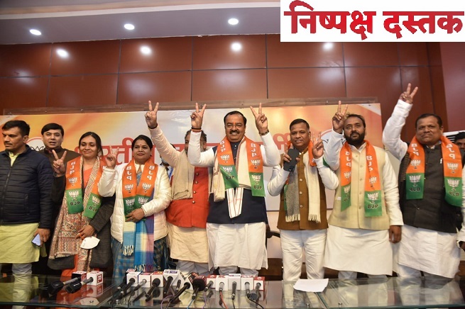 केशव प्रसाद मौर्य के समक्ष भारतीय जनता पार्टी के प्रदेश मुख्यालय पर सोमवार को कांग्रेस के प्रदेश उपाध्यक्ष व तिंदवारी (बांदा) से पूर्व विधायक श्री दलजीत सिंह, समाजवादी पार्टी की मऊरानीपुर (झांसी) से पूर्व विधायक श्रीमती रश्मि आर्या, बहुजन समाज पार्टी के पूर्व दर्जा प्राप्त मंत्री, झांसी-चित्रकूट मण्डल जोनल कोआर्डिनेटर व बबेरू (बांदा) से पूर्व विधानसभा प्रत्याशी श्री बृजमोहन सिंह कुशवाहा, जनवादी पार्टी के पूर्व प्रदेश अध्यक्ष श्री सत्येन्द्र चौहान तथा समाजवादी पार्टी से कायमगंज (फर्रूखाबाद) से पूर्व विधानसभा प्रत्याशी डा. सुरभि ने भाजपा की सदस्यता ग्रहण की। श्री मौर्य ने पट्का पहनाकर सभी नवागन्तुकों का भाजपा परिवार में स्वागत किया।इस दौरान प्रदेश उपाध्यक्ष व जॉइनिंग कमिटी के सदस्य श्री दयाशंकर सिंह, प्रदेश मीडिया प्रभारी मनीष दीक्षित, प्रदेश प्रवक्ता हीरो बाजपेयी भी उपस्थित रहे।