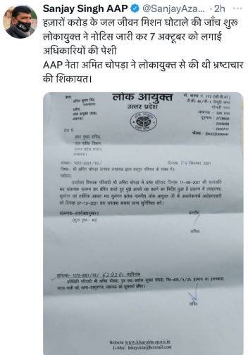 जल शक्ति विभाग के अपर मुख्य सचिव को लोकायुक्त का नोटिस, आप सांसद संजय सिंह ने किया था भ्र्ष्टाचार का खुलासा। आम आदमी पार्टी के नेता अमित चोपड़ा ने की थी लोकायुक्त से शिकायत। सत्ता और अहंकार के चलते जलशक्ति मंत्री ने घोटाले पर पर्दा डालने का कर रहे काम। लोकायुक्त की जांच की शुरुआत हो गई है, आने वाले समय में दोषियों को जेल जाना ही पड़ेगा।