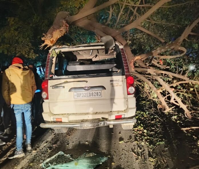 रुदौली/अयोध्या :- भेलसर से सुजागंज रोड पर सड़क किनारे खड़े वृक्षों की मोटी मोटी टहनियां नीचे झूल रही हैं। जो सड़क पर फर्राटा भर रहे भारी वाहनों से टकराती रहती हैं। पेड़ों की टहनियों से बचने के लिए चालक वाहनों को आड़ा-तिरक्षा कर निकालते हैं। जिससे हर समय हादसे का डर सताता रहता है। बीती रात एक ट्रक चालक पेड़ की डाल को नोंचते हुए निकला जिससे उसी ट्रक के पीछे आ रहे हयातनगर निवासी नबील अहमद की स्कार्पियो up32ed8283 पर जा गिरी जिससे स्कार्पियो बुरी तरह छतीग्रस्त हो गई इस घटना से भेलसर शुजागंज मार्ग पर लम्बा जाम लग गया।