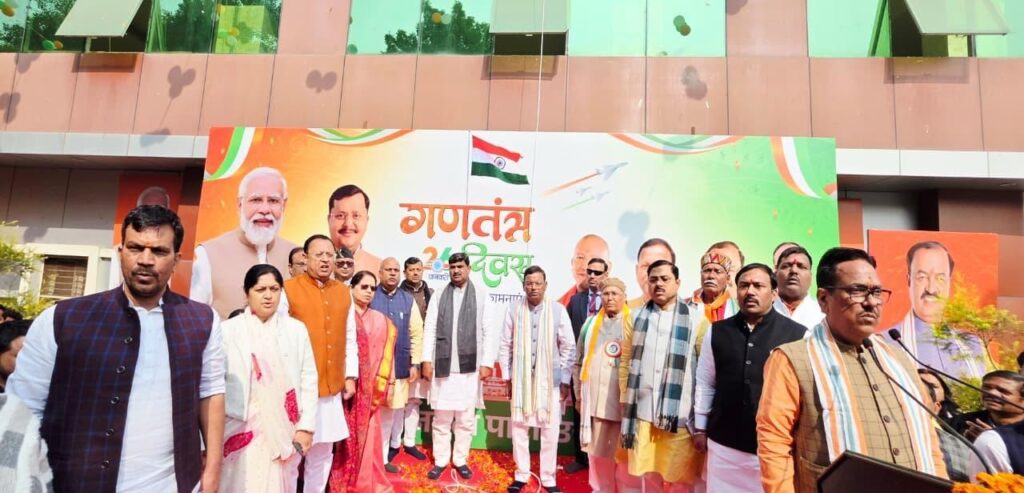 पंकज चौधरी ने कहा कि मोदी जी के नेतृत्व में संविधान को और मजबूती मिली है। मोदी काल में जो भी संशोधन हुए हैं वो संविधान की मूल अवधारणा के अनुकूल और राष्ट्र हित में रहे हैं। उदाहरणस्वरूप एक देश-एक कर,ईडब्ल्यूएस रिजर्वेशन,एक देश-एक विधान के संकल्प के साथ जम्मू कश्मीर से अनुच्छेद 370 की समाप्ति, महिलाओं को आरक्षण जैसे ऐतिहासिक निर्णयों से सशक्त राष्ट्र के रूप में भारत की छवि बनी है। भाजपा ने संविधान और संवैधानिक परम्पराओं को मजबूती देने का काम किया है। संविधान की मूल आत्मा को ध्येय मानकर मोदी सरकार ने सरकार की प्रत्येक योजना सेवा, सुशासन एवं गरीब कल्याण के लिए समर्पित की है।धर्मपाल सिंह ने कहा कि गणतंत्र दिवस हमें संविधान की गरिमा, लोकतंत्र की शक्ति और राष्ट्र सेवा के दायित्व का स्मरण कराता है। संविधान में निहित न्याय, समानता और बंधुत्व का भाव ही भारत की आत्मा है। प्रधानमंत्री नरेन्द्र मोदी जी के नेतृत्व में देश संवैधानिक आदर्शाे के मार्ग पर चलते हुए आत्मनिर्भर भारत, स्वदेशी से स्वावलम्बी भारत और भारत की सर्वांगीण उन्नति के संकल्प को सिद्ध कर रहा है।