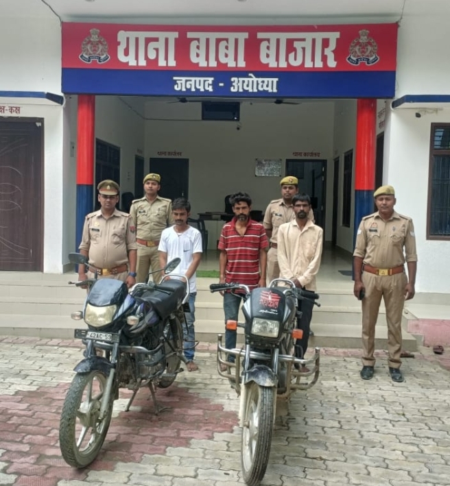 अयोध्या। बाबा बाजार जनपद अयोध्या पुलिस ने आपरेशन दृष्टि के तहत लगाये गये सीसीटीवी कैमरे व त्रिनेत्र पोर्टल की सहायता से हिस्ट्रीशीटर को उसके साथियो के साथ चोरी की दो मोटर साइकिल के साथ किया गया गिरफ्तार। हिमांशू श्रीवास्तव उर्फ रम्मन पुत्र स्व0 कृष्ण बिहारी श्रीवास्तव निवासी ग्राम शंकरपुर हरैया थाना कुड़ेभार जनपद सुल्तानपुर, रमेश पाण्डेय पुत्र स्व0 रामराज पाण्डेय निवासी ग्राम कड़बड़ का पुरवा मजरे अकमा थाना कुमार गंज जनपद अयोध्या, अरविन्द श्रीवास्तव उर्फ छोटू पुत्र स्व0 कृष्ण बिहारी श्रीवास्तव निवासी ग्राम शंकरपुर हरैया थाना कुड़ेभार जनपद सुल्तानपुर को बेंतवा नाला पुल बहद ग्राम बिहारा से गिरफ्तार किया गया है।