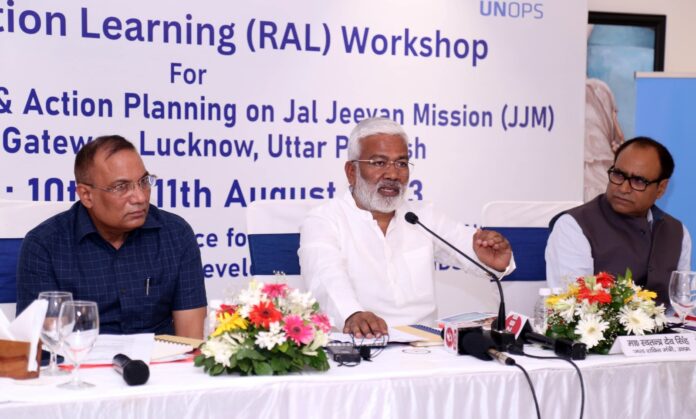 लखनऊ। प्रधानमंत्री नरेंद्र मोदी की सोच हमारा लक्ष्य है और उनका विजन ही हमारा मिशन। जल जीवन मिशन को यूपी की राज्य सरकार गति देने का कार्य कर रही है। हम प्रत्येक दिन 40 हजार से अधिक ग्रामीण परिवारों को नल कनेक्शन दे रहे हैं। योजना से जहां एक तरफ नल कनेक्शन दिये जा रहे हैं वहीं महिलाएं स्वावलंबी बन रही हैं। योजना से युवाओं को रोजगार के अवसर भी मिल रहे हैं। यह बातें गुरुवार को जल शक्ति मंत्री स्वतंत्र देव सिंह ने गोमतीनगर स्थित एक होटल में कहीं। वे यहां पर राज्य पेयजल एवं स्वच्छता मिशन और यूनाइटेड नेशन्स ऑफिस फॉर प्रोजेक्ट सर्विस (यूनॉप्स) के संयुक्त तत्वाधान में दो दिवसीय राज्य स्तरीय रैपिड एक्शन लर्निंग कार्यशाला का शुभारंभ करने पहुंचे थे। बतौर मुख्य अतिथि उन्होंने दीप प्रज्जवलन कर कार्यशाला की शुरूआत की। विभाग के अधिशासी निदेशक बृजराज सिंह यादव और यूनॉप्स के इंडिया हेड विनोद मिश्र ने पुष्पगुच्छ, अंगवस्त्र और मोमेंटों देकर जल शक्ति मंत्री का स्वागत किया।