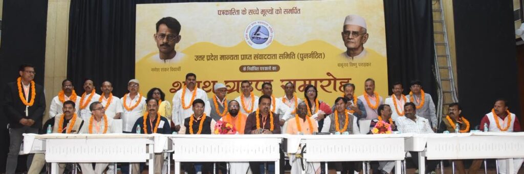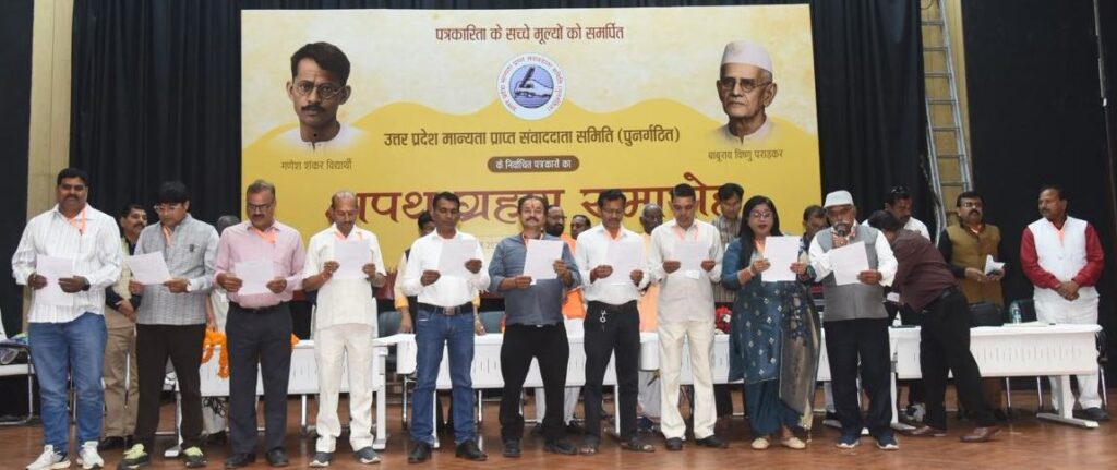 लखनऊ। पत्रकारिता के उच्च आदर्शों और मूल्यों को समर्पित वातावरण में उत्तर प्रदेश मान्यता प्राप्त संवाददाता समिति (पुनर्गठित) Uttar Pradesh Accredited Correspondents Committee (Reconstituted) के निर्वाचित पदाधिकारियों का प्रथम शपथ ग्रहण समारोह विश्वेश्वरैया हाल में भव्य और गरिमामयी ढंग से आयोजित किया गया। यह कार्यक्रम महान पत्रकार पुरोधाओं गणेश शंकर विद्यार्थी और बाबूराव विष्णु पराड़कर के आदर्शों को समर्पित रहा। समारोह में पत्रकारों, जनप्रतिनिधियों और विभिन्न क्षेत्रों के गणमान्य व्यक्तियों की उल्लेखनीय उपस्थिति रही। सरस्वती वंदना के साथ कार्यक्रम का शुभारंभ हुआ, जिसने पूरे माहौल को गरिमा और शालीनता से भर दिया।