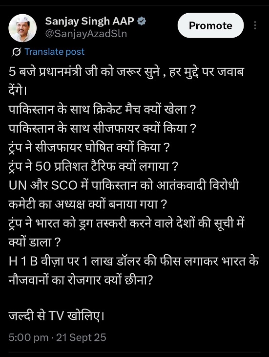 संजय सिंह ने मोदी सरकार की आर्थिक नीतियों पर व्यंग्य करते हुए कहा कि “बीएमडब्ल्यू की कारों का काफिला, स्विट्जरलैंड की घड़ी, जर्मनी का पेन, इटली का चश्मा, अमेरिका का फोन इस्तेमाल करने वाले मोदी जी आज स्वदेशी का ज्ञान बांट रहे थे। स्वदेशी की शुरुआत मोदी जी को खुद से करनी चाहिए।” उन्होंने तंज कसा कि गलवान घाटी में भारतीय जवान शहीद हो जाते हैं, लेकिन मोदी सरकार चीन से 39 लाख करोड़ का आयात करके घरेलू व्यापार को चौपट करने का काम करते हैं। देश के किसानों के जीवन पर डाका डालते हुए अमेरिकी कपास पर लगा 11% का आयात शुल्क घटाकर जीरो कर दिया जाता है, जबकि अमेरिका भारत पर 50% टैरिफ थोप देता है।