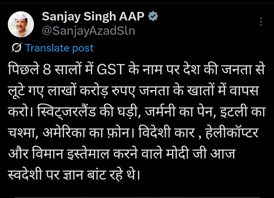 मोदी के भाषण पर AAP सांसद संजय सिंह ने दिया करारा जबाव। जीएसटी के नाम पर 8 साल की लूट का हिसाब दीजिए मोदी जी, जनता का पैसा वापस कीजिए। AAP सांसद संजय सिंह ने प्रधानमंत्री मोदी से मांग की कि जीएसटी के नाम पर वसूले गए पैसे सीधे जनता के खातों में वापस किए जाएं। बीएमडब्ल्यू की कारों का काफिला, स्विट्जरलैंड की घड़ी, जर्मनी का पेन, इटली का चश्मा, अमेरिका का फोन इस्तेमाल करने वाले मोदी जी आज स्वदेशी का ज्ञान बांट रहे। जीएसटी में भ्रष्टाचार और जनता से वसूली का हिसाब दें प्रधानमंत्री