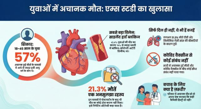 अखिल भारतीय आयुर्विज्ञान संस्थान और भारतीय चिकित्सा अनुसंधान परिषद की संयुक्त जांच में पाया गया कि अठारह से पैंतालीस साल के युवाओं की अचानक मौतों में 42 प्रतिशत मामलों में हृदय रोग ही कारण था, जिसमें बायीं अगली उतराने वाली धमनी में 70 प्रतिशत से अधिक रुकावट मिली। अधिकांश पीड़ित घटना से ठीक पहले पूरी तरह स्वस्थ दिखाई देते थे, क्योंकि यह रोग चुपचाप बढ़ता रहता है और कोई स्पष्ट चेतावनी नहीं देता।दक्षिण एशियाई लोगों में पचास साल से पहले हृदयाघात का खतरा पश्चिमी लोगों की तुलना में तीन-चार गुना अधिक होता है, जो आनुवंशिक संरचना से जुड़ा है।